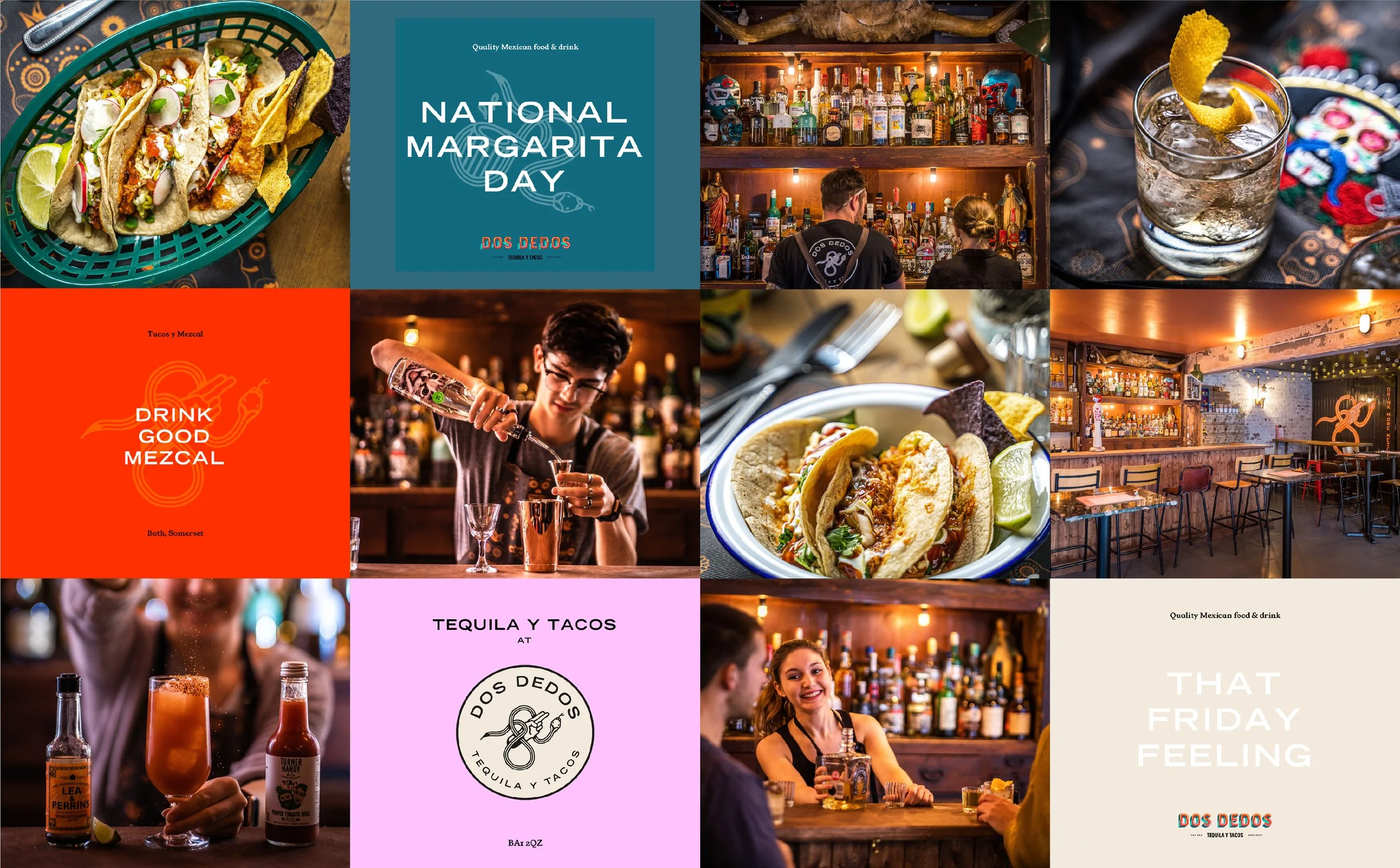 I led the full creative direction for Dos Dedos, a cantina style Mexican restaurant in the heart of Bath. My work encompassed the art direction, logo design, custom illustrations, website, social media templates, and photography.